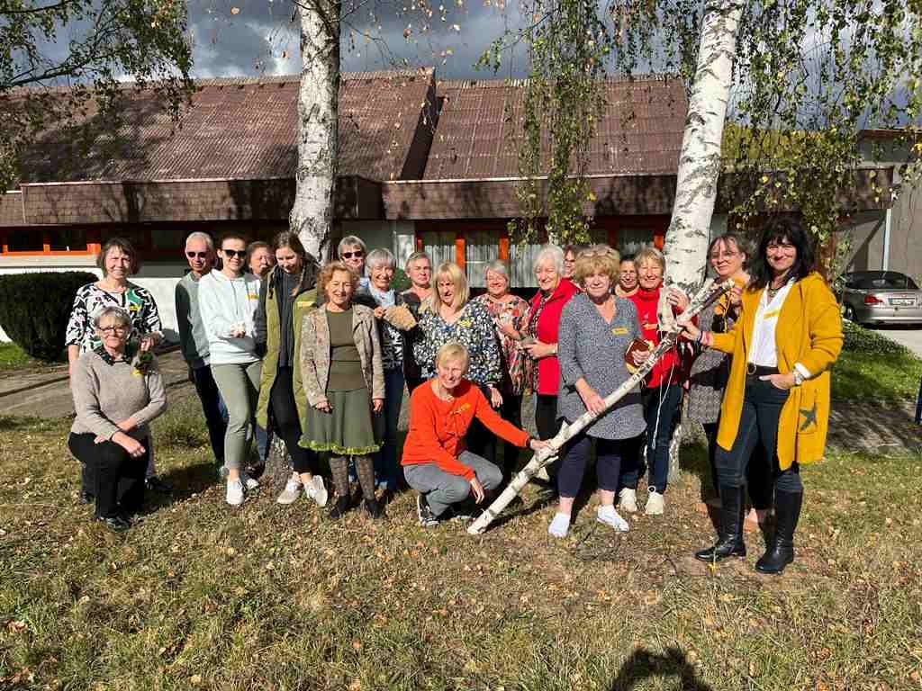 Glückliche und stolze Projektteilnehmerinnen gruppieren sich mit ihm hinter IHREM Gemeinschaftswerk.