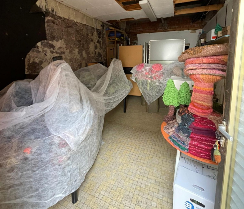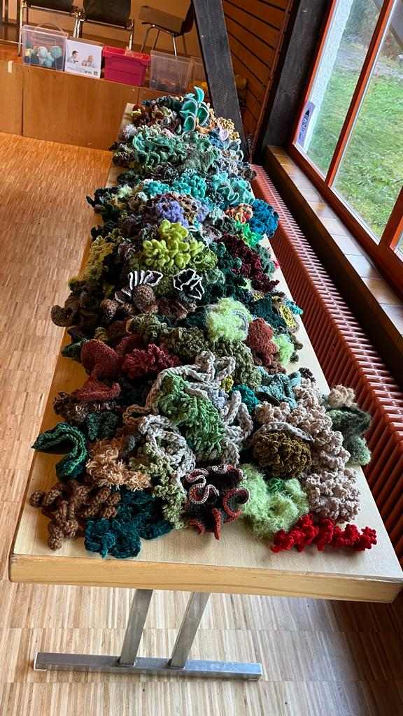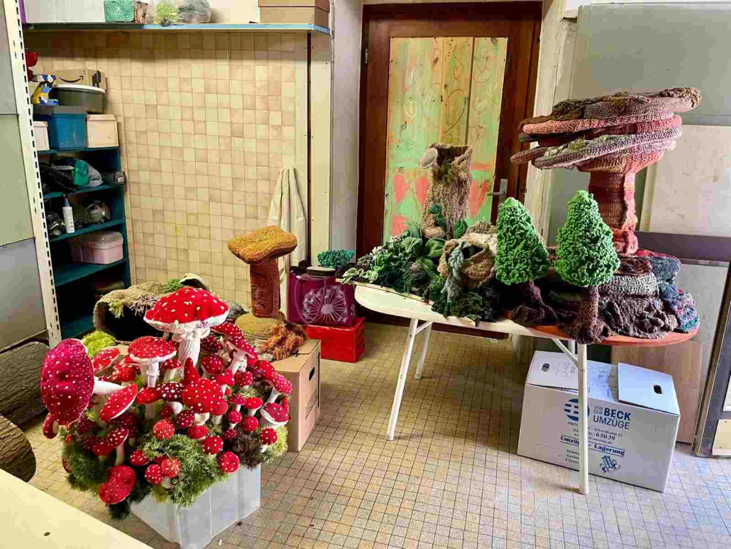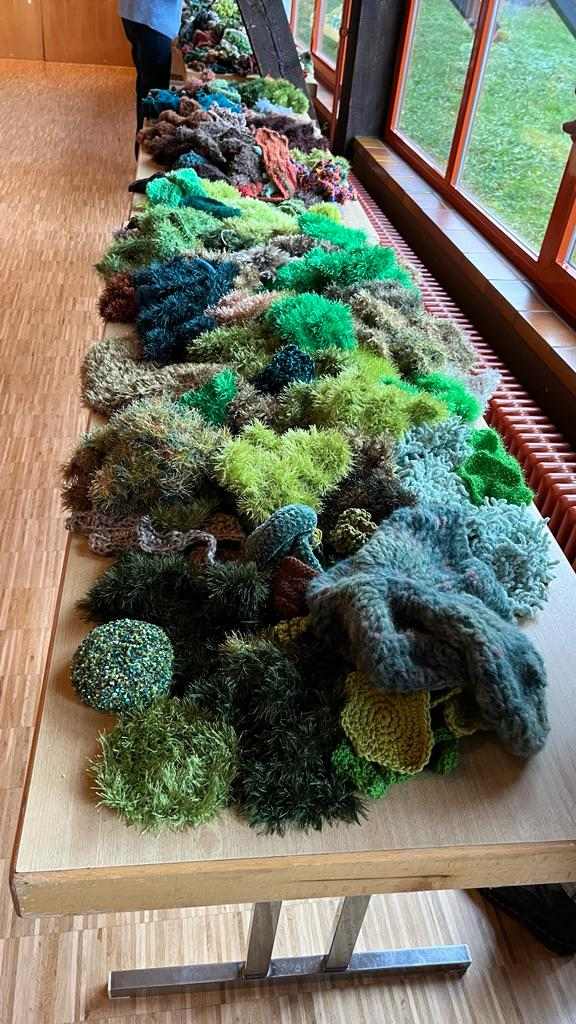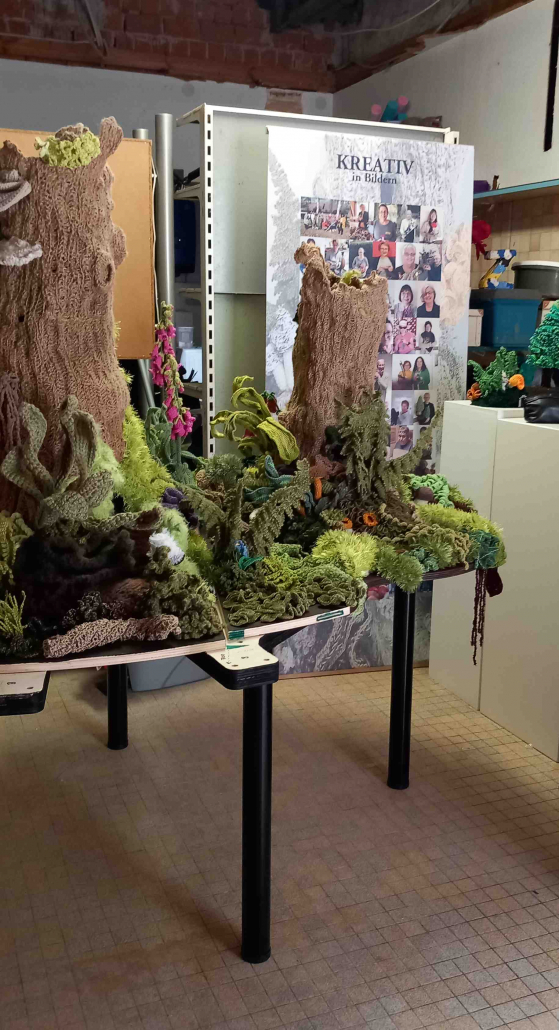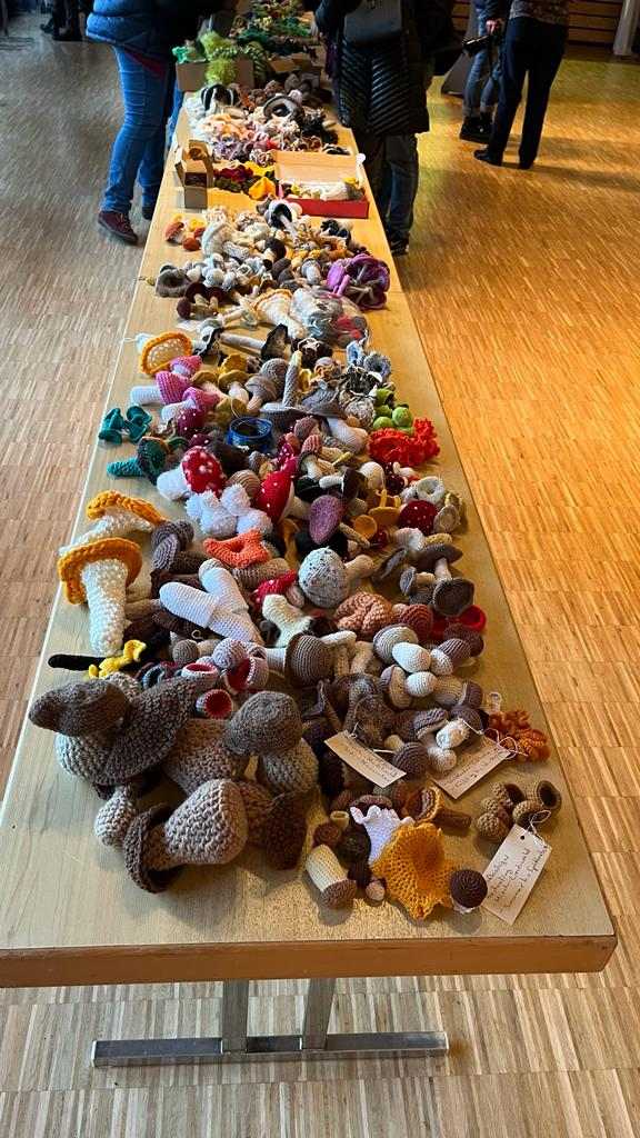 Alle Häkelteile wurden nach Leinsweiler gebracht und wieder füllen mehr als 2.500 Teile die großen Tische der Sonnenberghalle. Zusammen mit den Teilen aus der Halbzeit gab das mehr als 5.000 kleine Objekte, die für das große Gemeinschaftskunstwerk bereit liegen. Ein Vielfaches der ursprünglich geplanten Anzahl von 500 bis 1.000 Teilen.